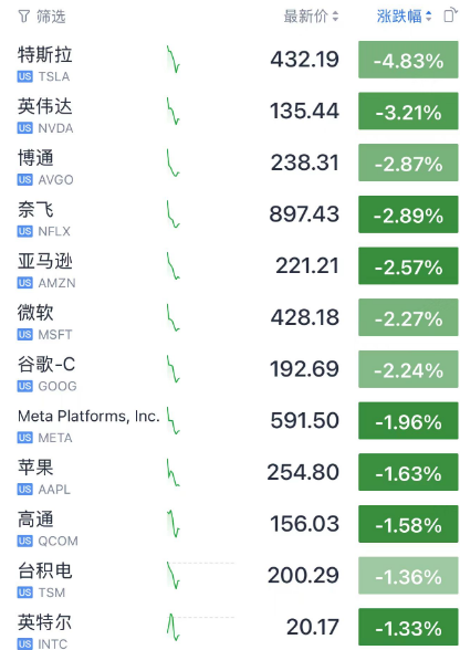 全球领先的科技公司在这场抛售潮中未能幸免,明星科技股集体走低。特斯拉股价下跌近5%,英伟达、博通、奈飞等科技巨头均下跌约3%,而电商巨头亚马逊的股价也下跌超过2%。此前,这些顶级科技股因强劲表现被誉为“七大天团”,占据了2024年美国股市基准指数涨幅的半壁江山。