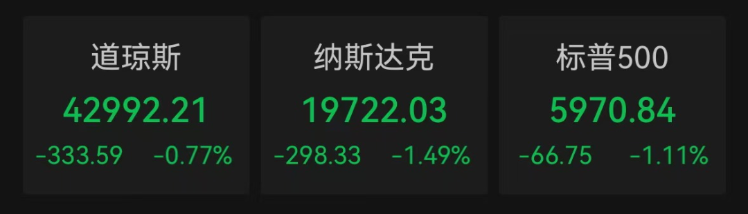 截至当日收盘,道指下跌0.77%,收于42,992.21点;标普500指数下滑1.11%,报5,970.84点;纳斯达克综合指数则重挫1.49%,跌至19,722.03点,再度跌破2万点心理关口。