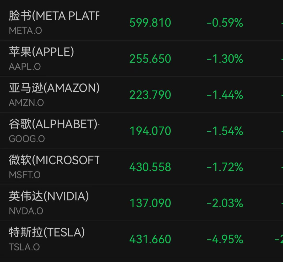 美股科技巨头中,七家主要企业股价集体走低,其中特斯拉领跌,跌幅接近5%。