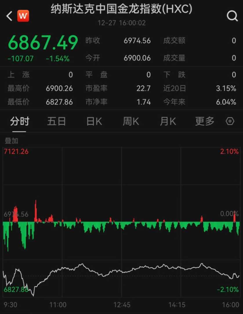12月27日,美股三大指数集体收跌,科技巨头与中概股承压下跌,其中道指终结日线五连涨,标普纳指连跌两日,热门中概股多数走低。