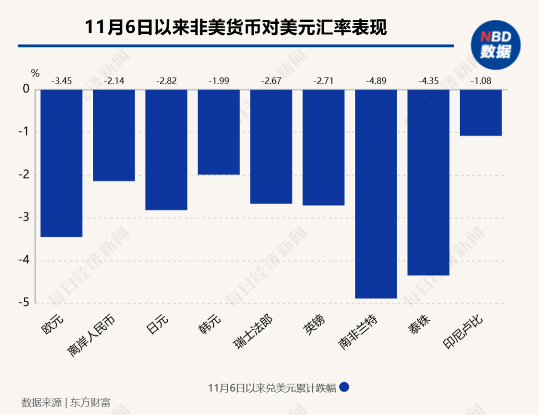 美元指数当日收涨0.53%,创一年新高。非美货币收跌。自11月6日特朗普宣布胜选以来,非美货币大幅贬值。欧元兑美元贬值3.45%,英镑和日元也创半年新低。新兴市场货币中,南非兰特贬值近5%,泰铢下跌4.35%,韩元创下两年新低。