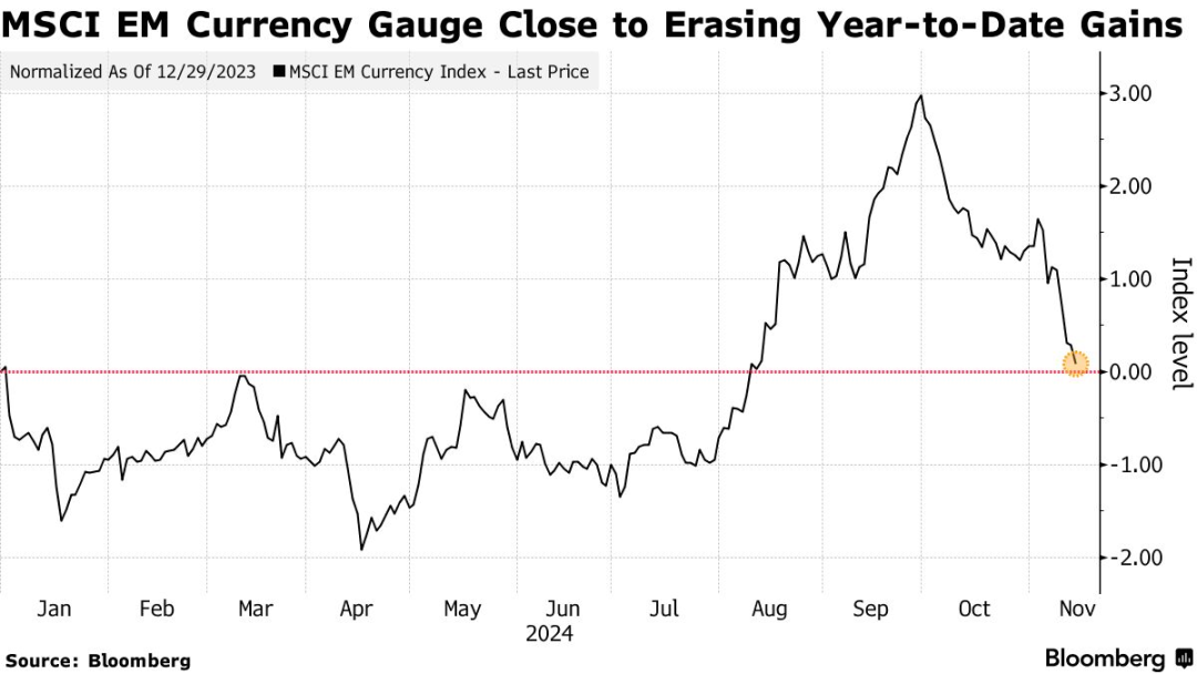 随着特朗普胜选及市场对美联储宽松货币政策预期转变,美元反弹势头明显,非美货币大幅贬值。11月14日,彭博美元现货指数升至2022年11月以来新高。欧元、日元等货币纷纷走低。