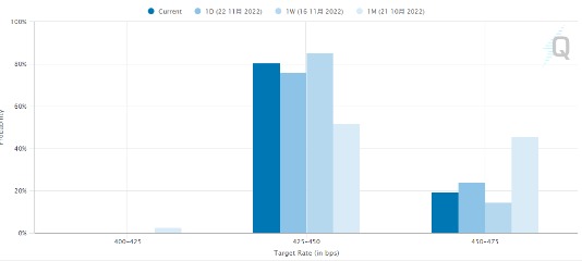 美联储11月纪要的关键要点包括:1. 绝大多数与会者认为可能很快就会放慢加息速度,最快可能从下个月开始将加息幅度降至50个基点;2. 利率峰值可能比联储官员之前预计的高,但支持这一观点的官员可能并不多;3. 美联储首次暗示明年美国经济衰退几率达五成,由于消费者支出放缓、全球经济风险和进一步加息的风险,衰退可能性上升。