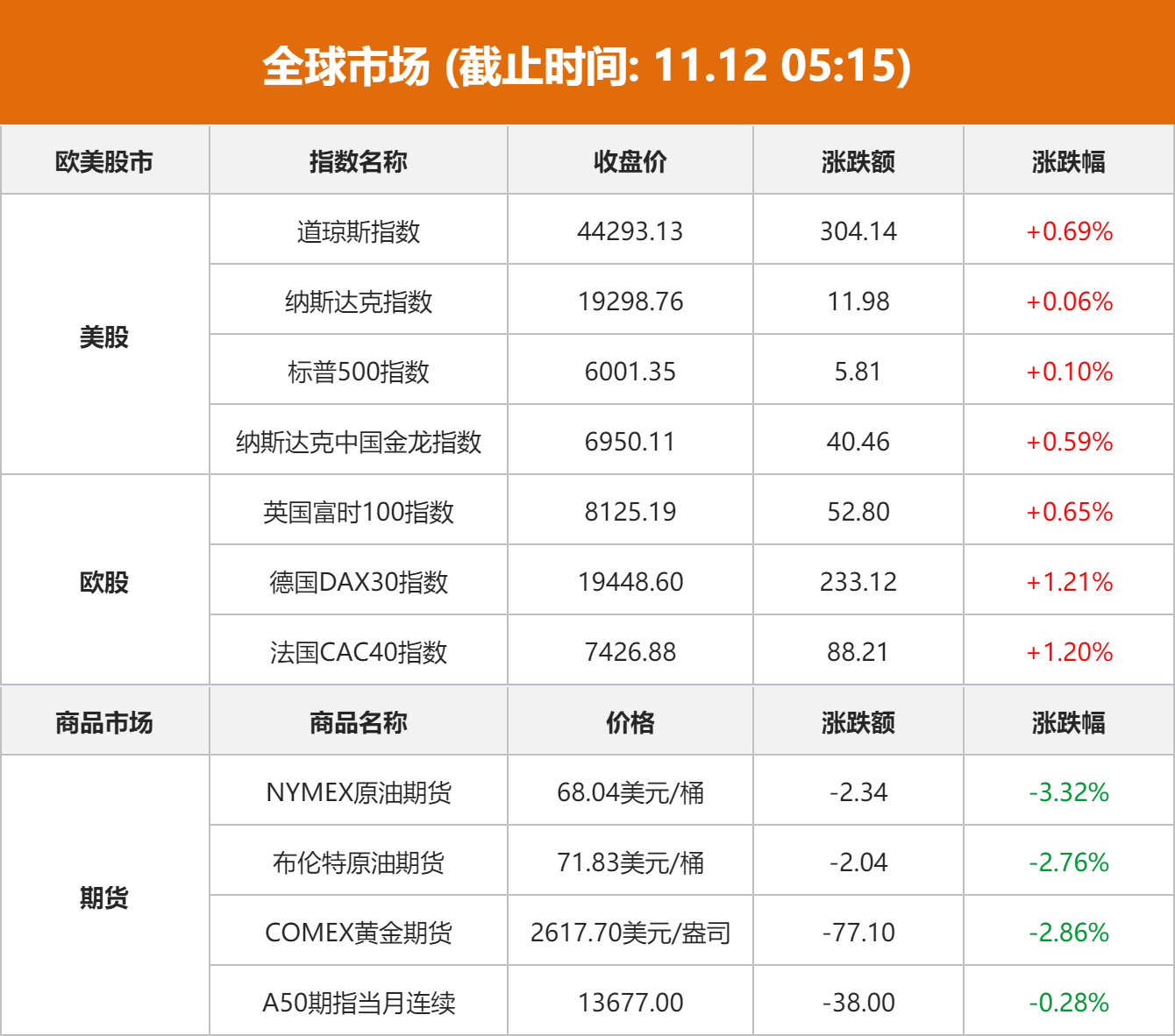 美股市场:近期,美股市场表现出色,三大指数均刷新历史新高。截至收盘,道琼斯工业平均指数报收44293.13点,较前一交易日上涨304.14点,涨幅达到0.69%;标准普尔500种股票指数则上涨5.81点,报收6001.35点,涨幅为0.10%;纳斯达克综合指数微涨11.98点,报收19298.76点,涨幅为0.06%。
