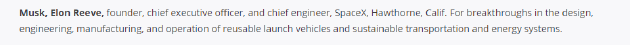 作为SpaceX的创始人,马斯克的主要工程成就体现在可重复使用运载火箭的革新以及可持续运输和能源系统的设计、制造与运营上,他取得了开创性的突破。