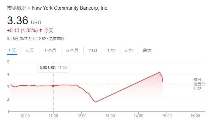 尽管股价有所反弹,但纽约社区银行的股价依然处于高度不稳定状态。截至发稿时,股价涨幅已缩窄至9%,报价为3.5美元。