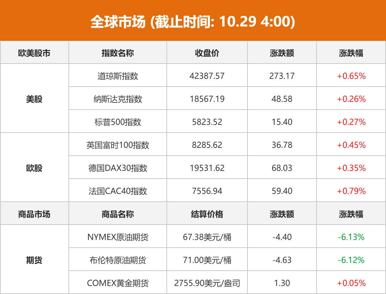 商品市场动态:国际油价在当日遭遇重挫,纽约商品交易所12月交货的轻质原油期货价格下跌4.40美元,收于每桶67.38美元,跌幅高达6.13%。同时,12月交货的伦敦布伦特原油期货价格也下跌4.63美元,收于每桶71.00美元,跌幅同样达到6.12%。然而,国际金价却有所上涨,COMEX黄金期货价格上涨1.30美元/盎司,涨幅0.05%,报2755.90美元/盎司。