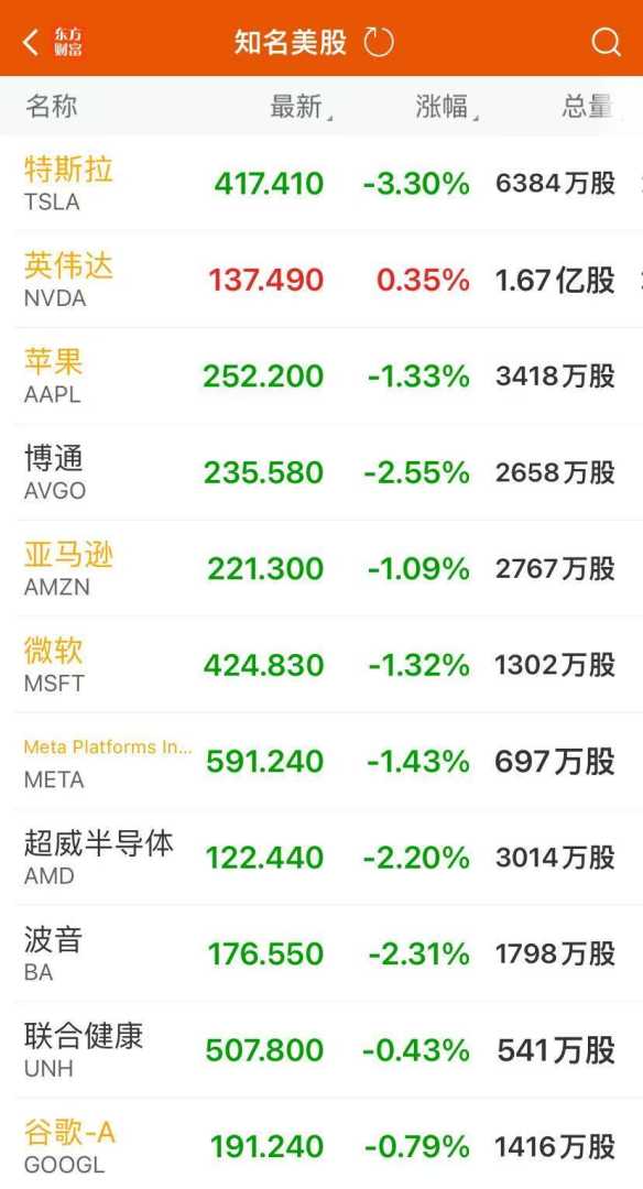 科技股方面,除特斯拉外,苹果、微软、亚马逊、Meta等科技巨头均下跌超过1%,谷歌和奈飞也呈现小幅下跌态势。半导体行业同样表现不佳,Wolfspeed收跌7.41%,超微电脑跌4.07%,多家半导体企业跌幅超过3%。