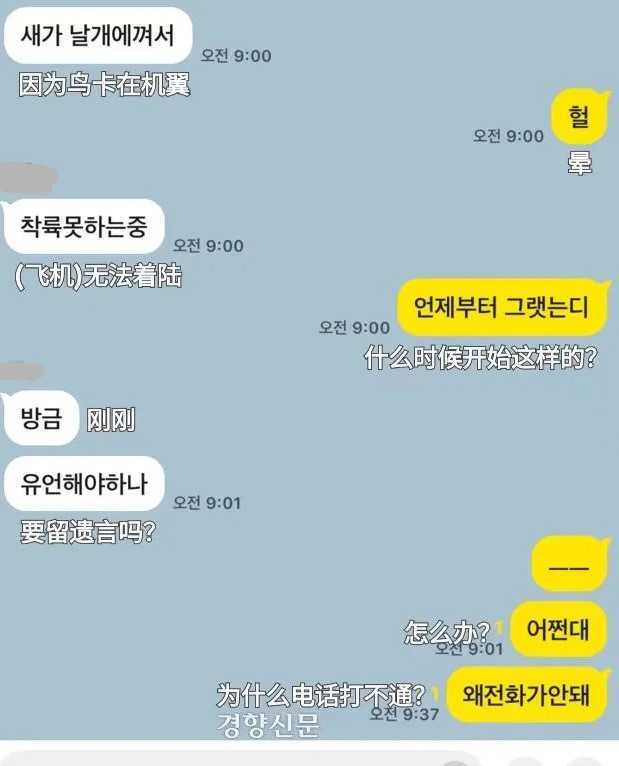 在这起韩国历史上最严重的空难事件中,一些乘客在生命最后一刻向家人发送的信息在社交媒体上被广泛传播。有乘客在机上起火前与家人线上聊天时表示,飞机因一只鸟卡在机翼里而无法降落,随后便失去了联系。还有乘客留言称飞机被鸟卡住无法降落,并突然要求打电话向家人告别。