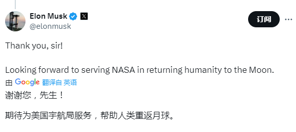 作为NASA阿尔忒弥斯月球计划的一部分,SpaceX赢得了数十亿美元的合同,负责使用星舰作为载人登月器。马斯克对此回复称:“谢谢您,先生!期待为NASA服务,将人类重新带回月球。”