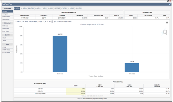 根据芝加哥商品交易所的美联储观察工具,交易员目前预计11月份降息25个基点的可能性约为80.3%,不降息的概率为19.7%,而降息50个基点的可能性已经降至0,一周前这一可能性还高达35.2%。