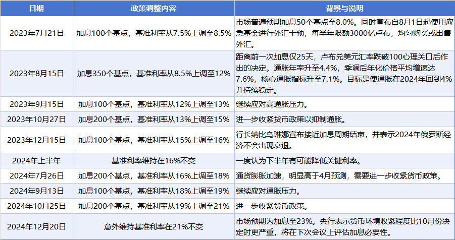 自2023年7月起,俄罗斯央行进入加息周期。7月21日,俄央行意外加息100个基点至8.5%,远超预期的50个基点。同时,宣布自8月1日起,利用应急基金干预外汇市场,每半年限额3000亿卢布。面对卢布汇率的大幅波动,8月15日,俄央行再次特别会议,将基准利率上调至12%。此后,俄央行持续加息,至12月15日,利率已升至16%。然而,2024年7月,俄央行再度加息200个基点至18%,并暗示未来可能继续加息。此后,加息步伐未停,至12月,基准利率维持在21%。俄央行表示,将综合评估加息必要性,并考虑经济状况和通胀动态。