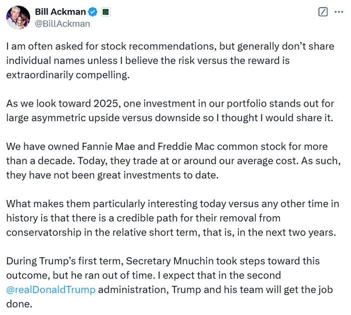美国对冲基金亿万富翁比尔·阿克曼于当地时间12月30日在社交媒体平台X上发布了一条引人瞩目的预测。他预计,在未来两年内,抵押贷款领域的两大巨头——房利美和房地美,将有望成功摆脱政府托管状态,并可能于2026年顺利实现IPO。