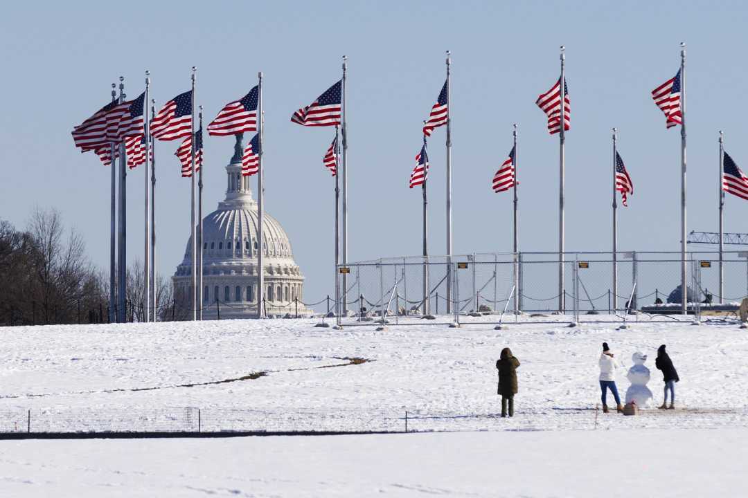 1月17日,人们在美国首都华盛顿雪后的国家广场游玩。新华社发(亚伦摄)