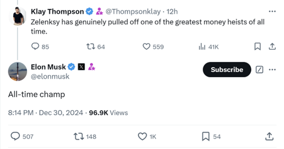 特朗普的亲密盟友马斯克也对美国援助乌克兰持反对态度,多次批评美国政府的做法,甚至称乌克兰总统泽连斯基为“打劫美国的冠军”。