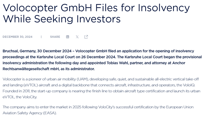 当地时间12月30日,德国电动垂直起降(eVTOL)飞机制造商Volocopter正式向法院申请破产保护,原因是公司难以继续筹集新的资金来维持日常运营。