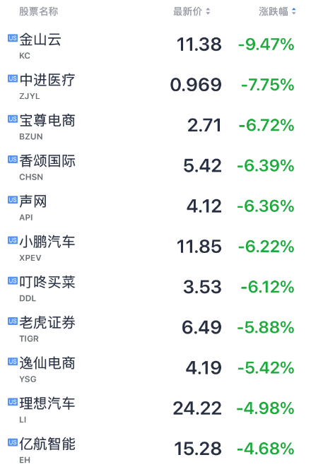 中国资产方面,纳斯达克中国金龙指数日内跌幅扩大至2%。金山云跌幅接近10%,小鹏汽车跌幅超过6%,理想汽车跌幅约5%。