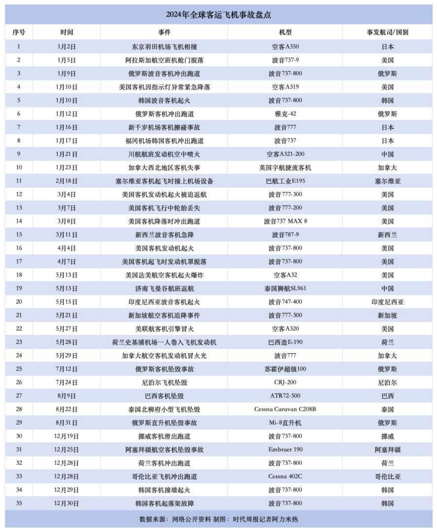 2024年末,全球航空业接连遭遇多起重大事故,其中韩国济州航空波音737-800客机事故最为严重,机上179人遇难。波音公司再次成为舆论焦点,今年发生事故的飞机中超一半属于波音。事故频发引发对其制造质量和安全标准的质疑。
