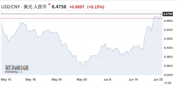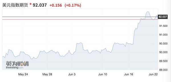 截至北京时间6月22日19:00,美元指数已攀升至92.047,一周内涨幅接近2%;同时,美元对在岸和离岸人民币的汇率分别报6.4733和6.4806。