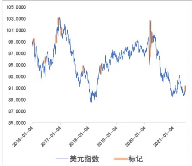 图中标黄处为近五年来美元指数单日波动大于0.9%的时点。