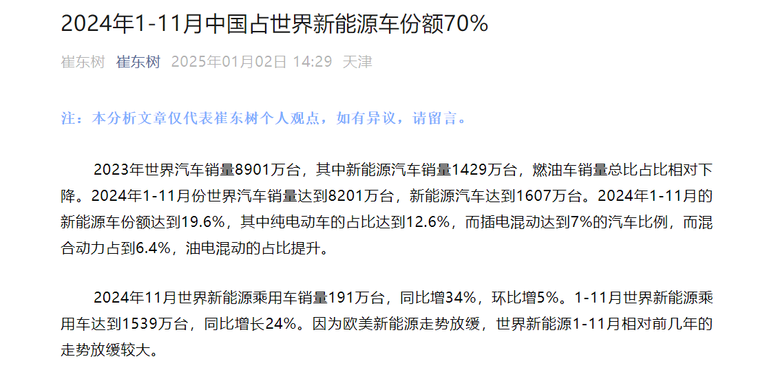 中国新能源乘用车市场增速强劲,近年来在全球市场的份额持续攀升,2024年1-11月已保持69.6%的份额,其中10-11月达到76%,彰显了中国在全球新能源汽车领域的领先地位。