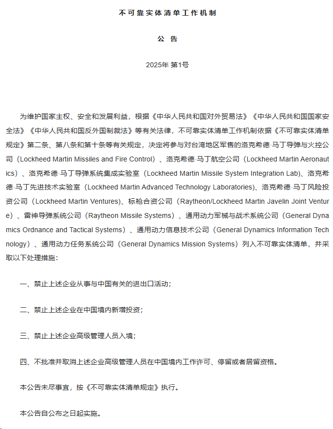 每经AI快讯,2025年1月2日,中国商务部正式对外宣布,将洛克希德·马丁导弹与火控公司等共计10家美国企业列入不可靠实体清单,并随即采取了一系列严厉措施。具体措施包括:全面禁止这些企业参与任何与中国相关的进出口业务;严格限制其在华新增投资活动;明确禁止其高层管理人员入境中国;同时,不批准并撤销其在华工作许可及居留资格。