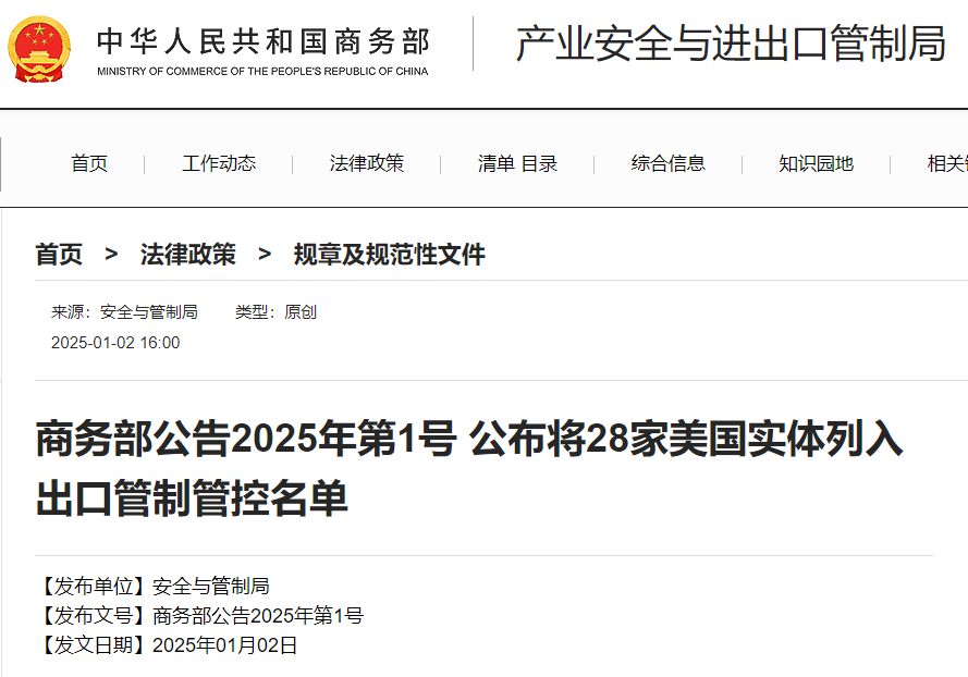 2025年1月2日,商务部发布重要公告,宣布将通用动力公司等28家美国实体纳入出口管制管控名单,此举旨在维护国家安全和利益,并履行防扩散等国际义务。