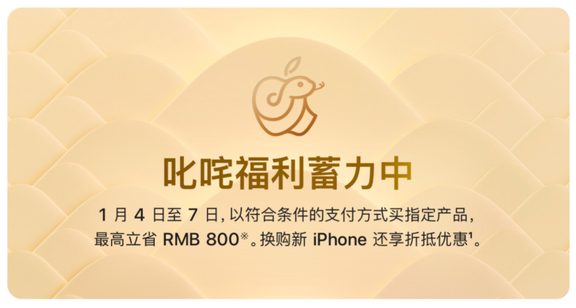 元旦假期刚结束,苹果公司于1月2日突然在其中国官网上宣布了“叱咤福利”新年促销活动,该活动将于1月4日至7日举行。消费者在购买指定商品时,最高可节省800元人民币,同时换购新iPhone还能享受折抵优惠。此消息一出,“苹果官网突然降价”迅速成为网络热搜话题。