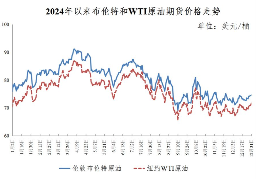 2025年1月2日,国内成品油价格上调,汽柴油每吨均上调70元。国际油价在调价周期内震荡上行,受美联储降息、制造业PMI指数符合预期等因素影响,市场信心提振。未来短期内,国际油价将继续呈区间震荡走势。