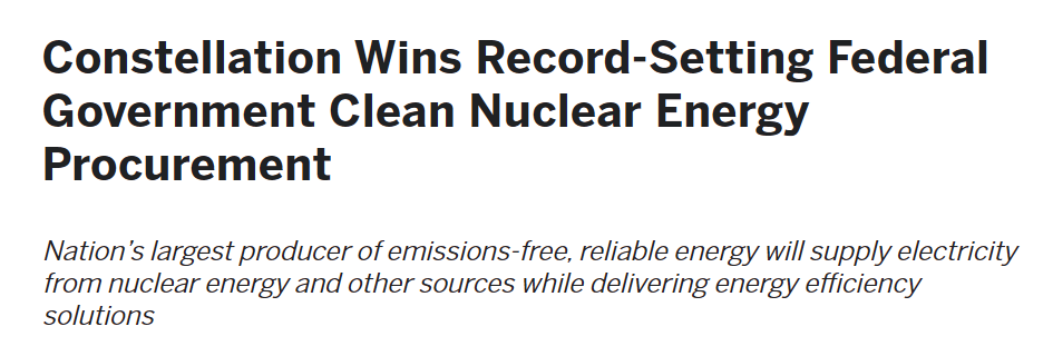 星座能源公司宣布获得美国联邦政府超过10亿美元的清洁核能采购订单,包括为期10年的供电合同和节能绩效合同,此举将加速实现无碳能源未来,美股核电板块整体走强。