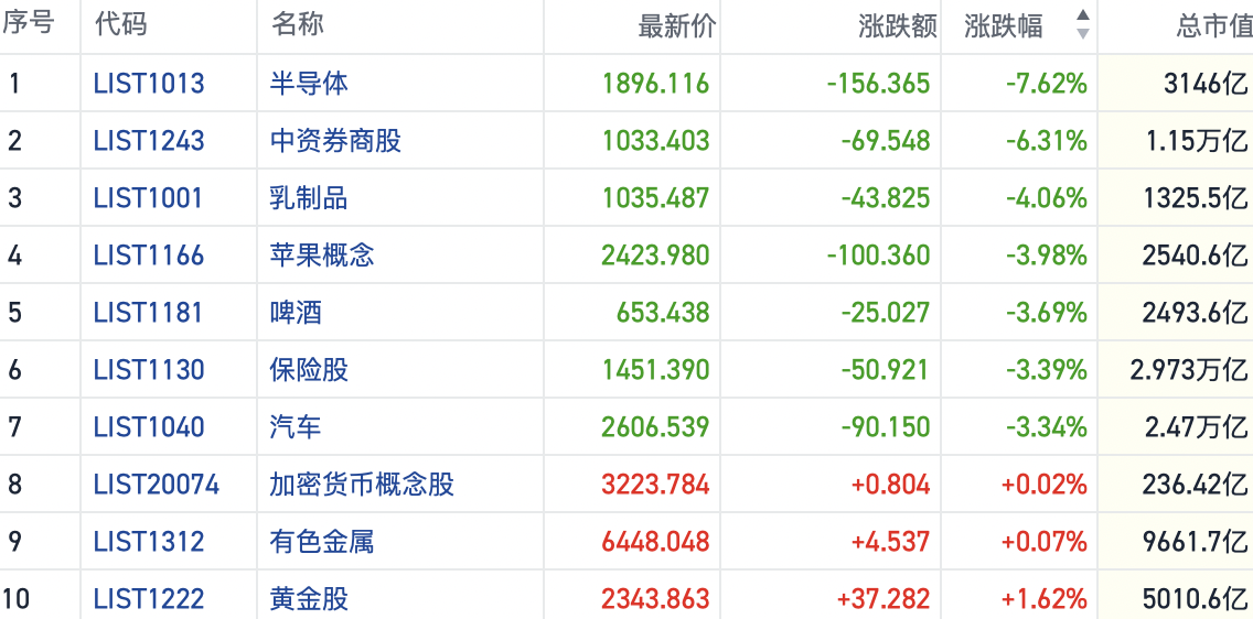 券商、保险、银行三大金融板块齐跌,对市场情绪形成压制,国联证券跌幅接近9%。半导体、消费电子、啤酒、餐饮、汽车、光伏、医药、煤炭、航空等行业也呈现不同程度的下行趋势。然而,黄金股表现突出,部分家电、零售股走势相对抗跌。