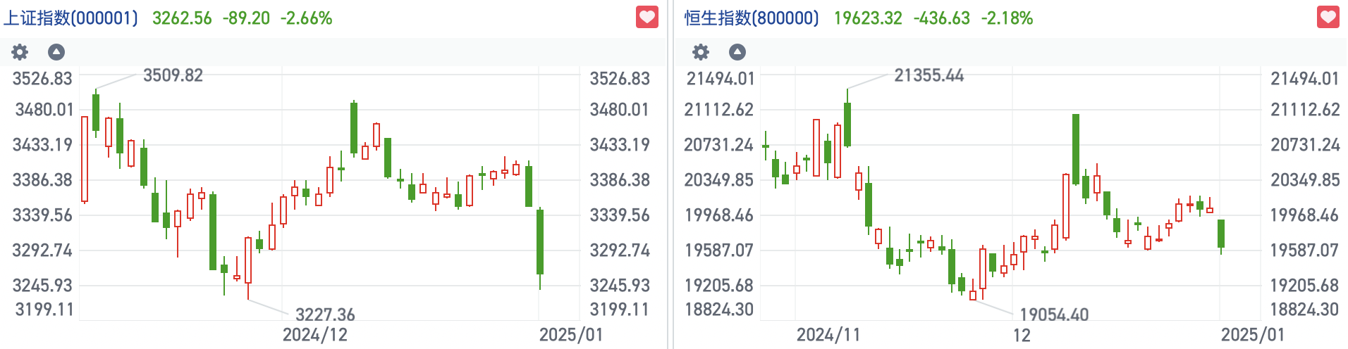此外,A股市场也延续了元旦节前的跌势,进一步加重了市场担忧。2025年首个交易日,A股全天单边下行,创业板指领跌,沪指失守3300点。然而,随着政策预期的逐步兑现,港A两市近期也开始转向对年报行情的关注,红利板块明显受到追捧。