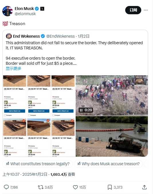 面对这一指责,马斯克在帖子中直接回应道:“100%叛国”。这一回复无疑加剧了事件的紧张氛围,使得原本就备受关注的边境政策问题更加引人注目。
