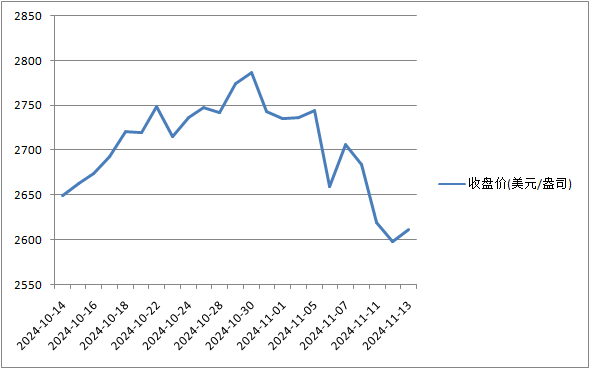 近几日,金价进一步回撤至2600美元/盎司的关键技术点位,11月12日收盘时甚至跌破了2600美元关口。截至北京时间13日20:00,金价约为2610美元/盎司。