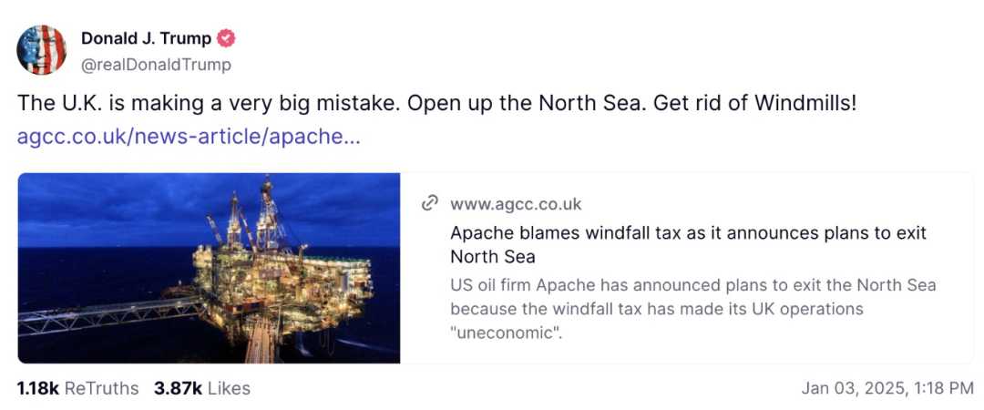 财联社1月3日讯当地时间周五(1月3日),美国当选总统特朗普在Truth Social上发帖,呼吁英国开放北海油田,并提议拆除部分风力发电机。此举引发全球能源市场关注。