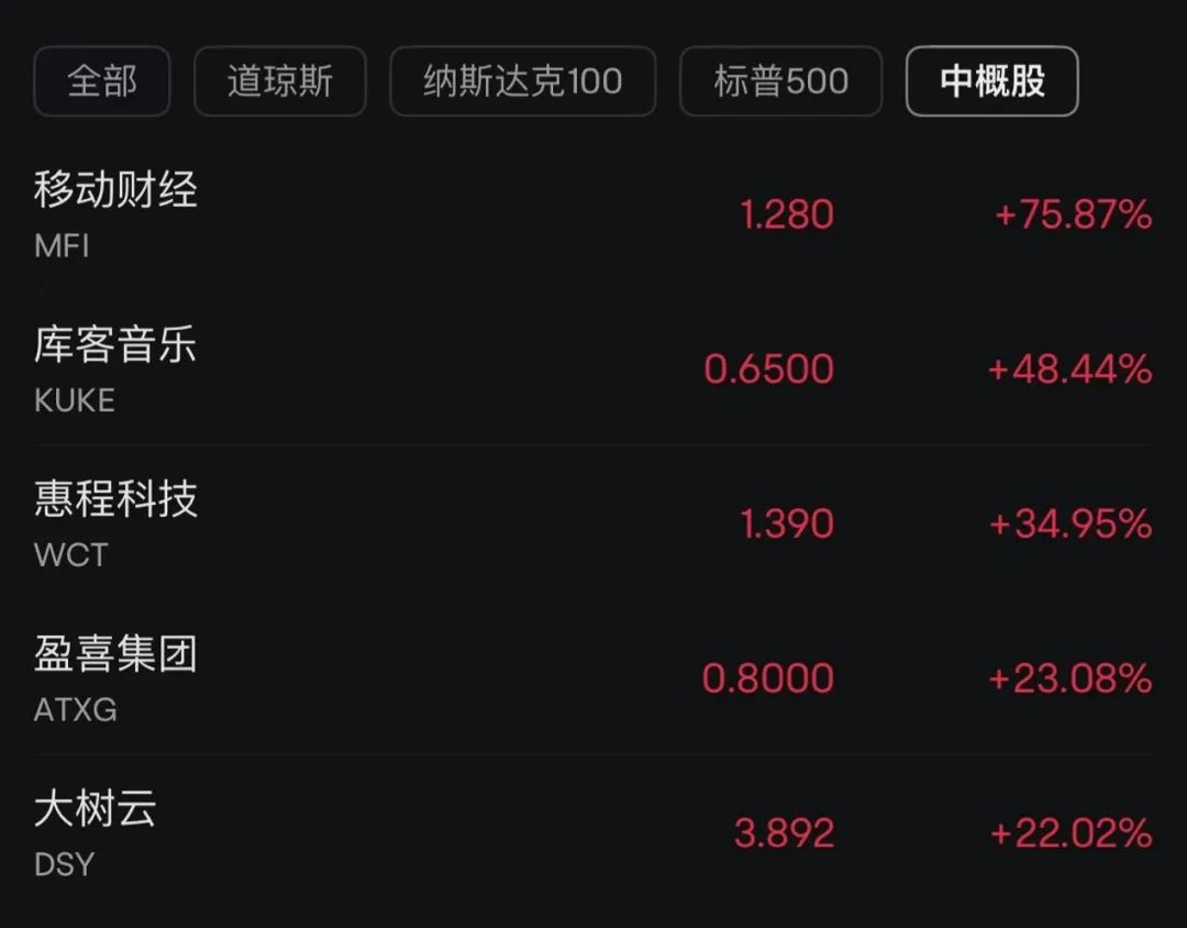 昨夜,美股市场迎来强势反弹,三大指数均呈现高开高走的态势,集体收涨,其中科技股板块表现尤为亮眼。中概股在整体市场中表现抢眼,多数个股上涨,且有多只个股涨幅超过20%,更有部分个股涨幅惊人,达到了75%以上。