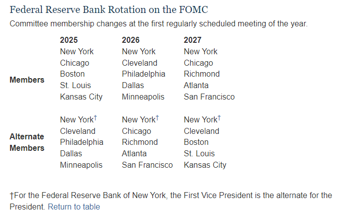 根据规定,FOMC共有19名成员,每次会议全员参加,但只有12名成员拥有投票权,包括7位美联储理事、纽约联储主席以及其余11位地区联储主席中的4位。这4位地区联储主席的任期均为一年。