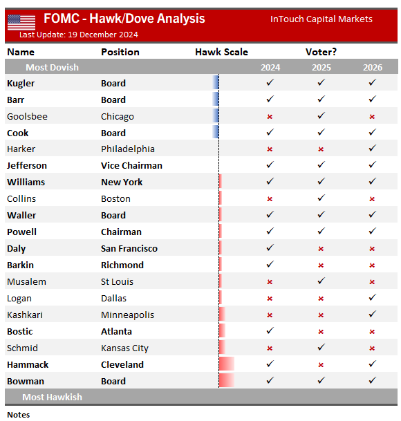 据InTouch Capital Markets报告,四位新成员中,芝加哥联储主席古尔斯比是唯一的“鸽派”,而波士顿联储主席柯林斯和圣路易斯联储主席穆萨莱姆被归为“轻度鹰派”,堪萨斯城联储主席施密德则为“中度鹰派”。