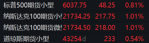 在稍早前的22:10,美国股指期货市场表现强劲,道琼斯工业平均指数期货上涨0.54%,标普500指数期货上涨0.81%,纳斯达克综合指数期货的涨幅更是高达1.01%。