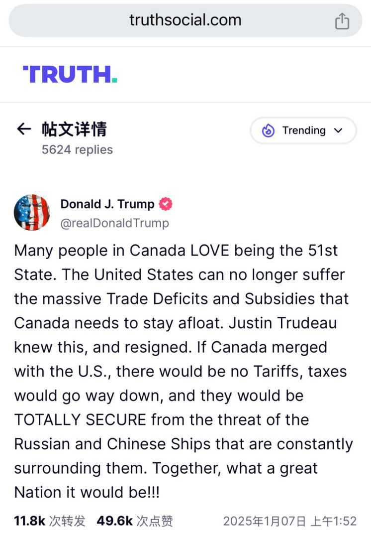 加拿大总理贾斯汀·特鲁多宣布辞职后,美国当选总统特朗普再次在社交媒体上提出了一项惊人的设想:美国和加拿大“合并”。特朗普在Truth Social平台上发表言论,指出若加拿大成为美国的第51个州,将不再面临关税壁垒。