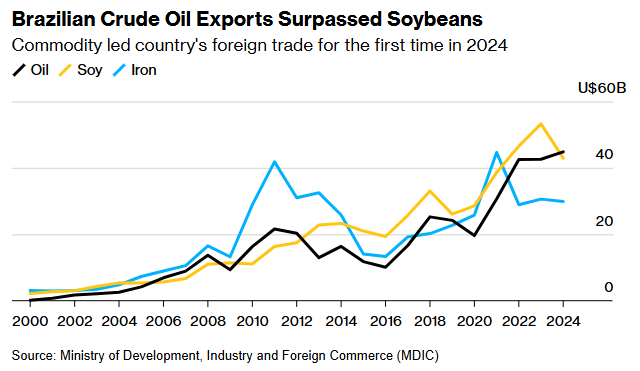 巴西贸易部周一发布的数据显示,2024年巴西原油出口额实现了5%的增长,总额达到448亿美元,这是巴西石油出口额首次超越大豆等其他传统出口商品,成为该国第一大出口产品。大豆则退居第二。