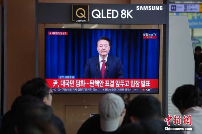 回顾当地时间2024年12月7日,在韩国首尔火车站,民众通过电视画面观看了尹锡悦总统的公开讲话,场面热烈。图为中新社记者刘旭摄。