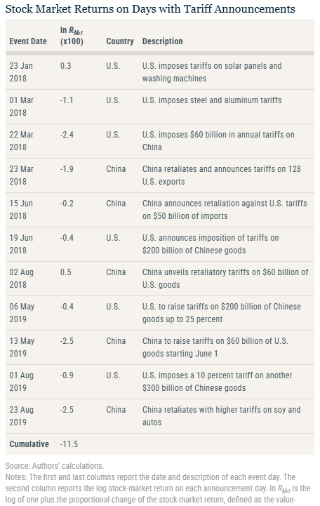 报告还深入分析了关税对金融市场的影响。纽约联储的研究发现,加征关税的公告对股票市场估值产生了显著影响。特别是在2018年3月和2019年5月,关税消息发布后,美股市场出现大幅下跌,11个关税官宣日当天累计跌幅达11.5%,市值损失高达4.1万亿美元。
