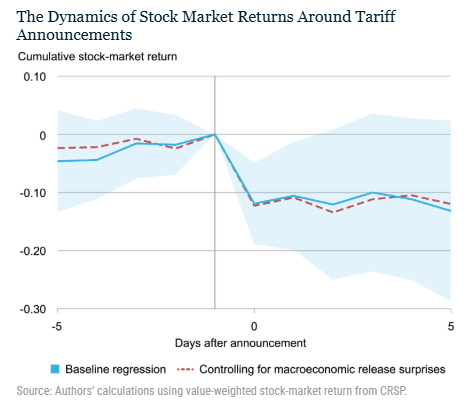 尽管有人将短期下跌视为市场过度反应,但统计数据并不支持这一观点。纽约联储的研究显示,关税公告发布前后十天内,美股市场的累计回报呈现明显下跌趋势,且市场并未在公告发布后的一周内形成有效反弹。这表明市场并未完全预期到这些关税的出台。