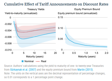 此外,股市价格下跌可能反映了市场对未来公司利润的悲观预期,以及投资者持有风险资产意愿的降低。研究发现,关税公告确实刺激了投资者逃向避险资产,导致美债收益率下降,股权溢价上升。