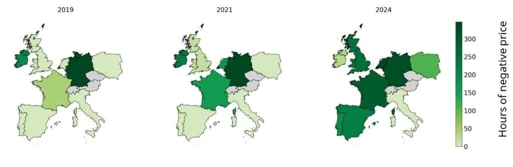 欧洲电力交易所(Epex Spot)数据显示,2024年德国负电价时长达到468小时,同比增长60%以上。同时,英国、法国负电价时长也显著增加,西班牙更是首次出现负电价现象,凸显负电价趋势在欧洲的蔓延。