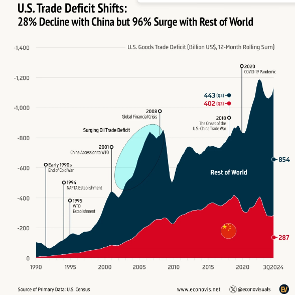 随着贸易摩擦升级,美国贸易逆差结构发生重大变化。根据美国联邦普查局数据,2018年前9月至2024年前9月,美国整体贸易逆差增长37%,从6350亿美元增至8720亿美元。其中,对华贸易逆差下降28%,从3010亿美元降至2170亿美元;而与世界其他地区(不包括中国)的贸易逆差飙升96%,从3340亿美元增至6550亿美元。