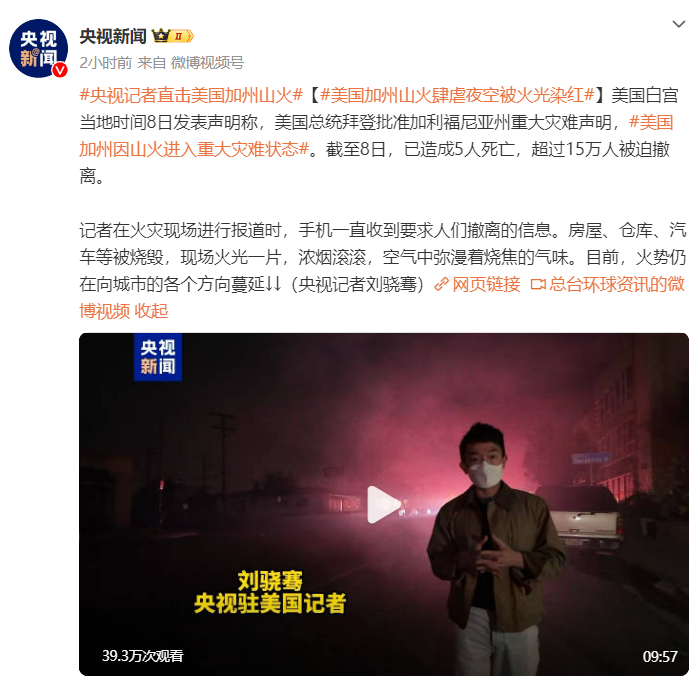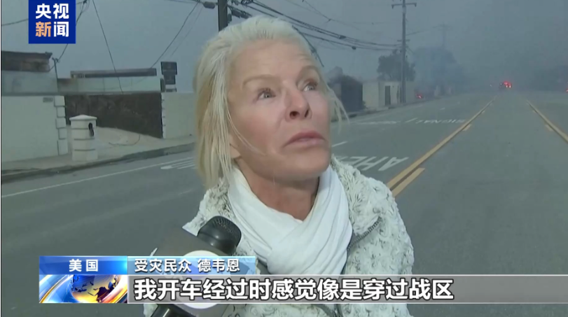 央视记者刘骁骞(@刘骁骞)在山火肆虐的洛杉矶市北区火灾现场进行报道时表示,火场感觉就像是在战区,当地仿佛刚刚遭遇了空袭。受灾民众也表示:“简直就像是世界末日,我开车经过时感觉像是穿过战区,我不知道该说什么,太震惊了,我为我们的社区被摧毁感到难过。”