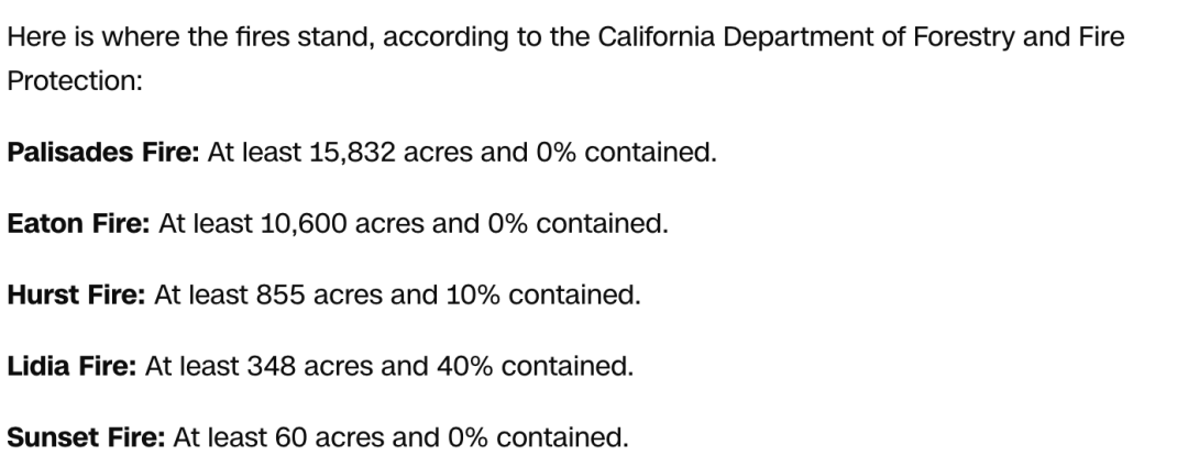 目前,洛杉矶地区共有四处大型火灾,分别是太平洋帕利塞德的大火、伊顿大火、赫斯特大火和日落大火。这些火灾已蔓延至数千至上万英亩的土地上,灭火工作遭遇供水系统不堪重负、断电阻碍供水、强风裹挟余烬等多重阻碍,火灾不断蔓延。