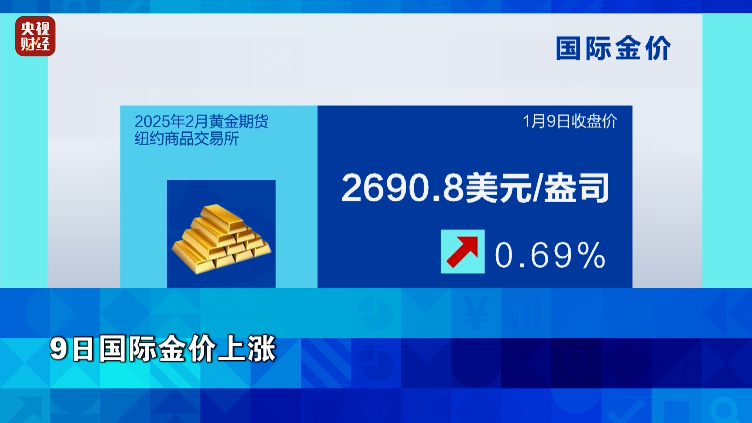9日,国际金价同样录得上涨。美欧通胀上行压力及全球多地地缘冲突加剧,促使部分资金涌入黄金市场寻求避险。国际金价周四上涨,并触及近一个月以来新高。截至收盘,纽约商品交易所2025年2月黄金期货价格收于每盎司2690.8美元,涨幅0.69%。